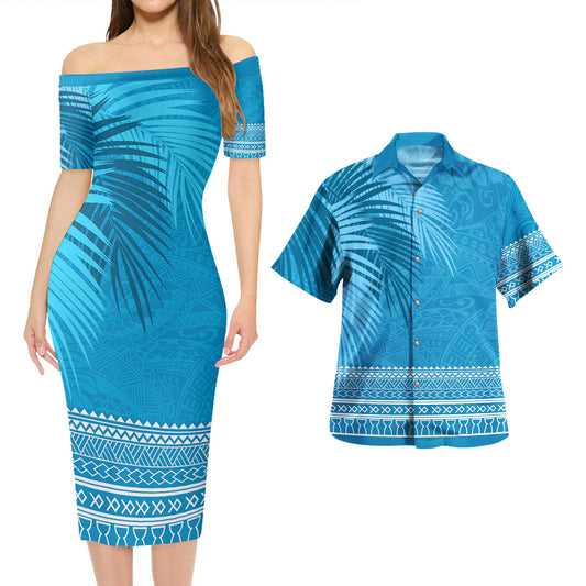 Guam Combo Off Shoulder Long Dress And Shirt Hibiscus With Polynesian Pattern Blue Version