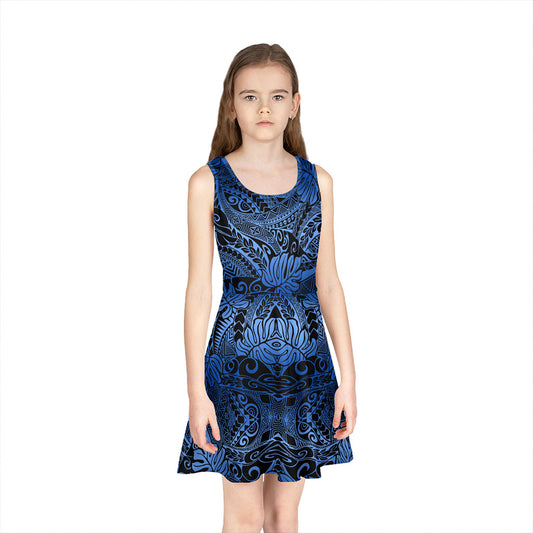 Hawaii Girls Sleeveless Sundress Polynesia Pattern Tattoo Blue