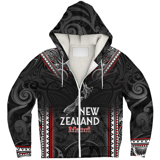 New Zealand Sherpa Hoodie Maori Patterns With Map Silver Fern