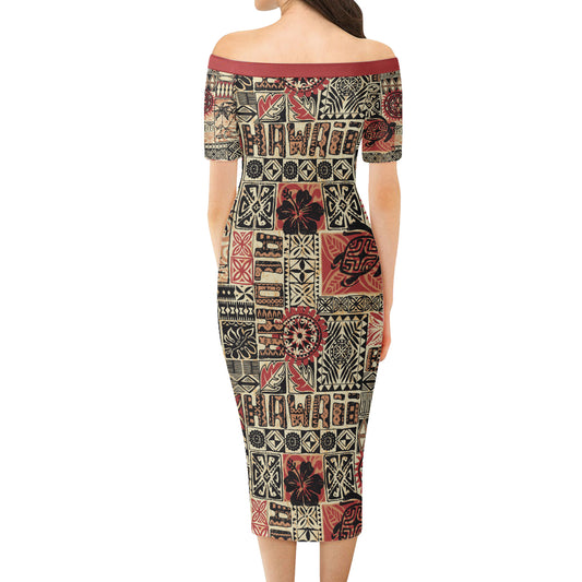 Hawaii Short Sleeve Off The Shoulder Lady Dress - Hawaiian Style Tribal Fabric Patchwork