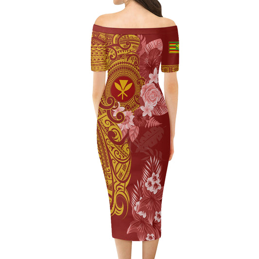 Hawaii Kanaka Maoli Short Sleeve Off The Shoulder Lady Dress Polynesian Tropical Plumeria Tribal Red