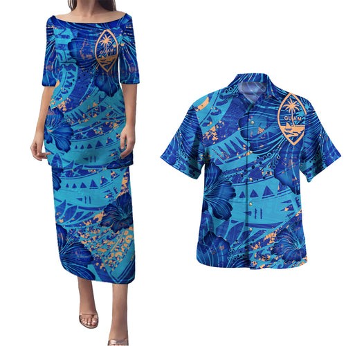 Guam Combo Puletasi And Shirt Hibiscus With Polynesian Pattern Blue Version
