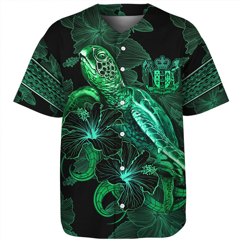 New Zealand Baseball Shirt Sea Turtle With Blooming Hibiscus Flowers Tribal Green