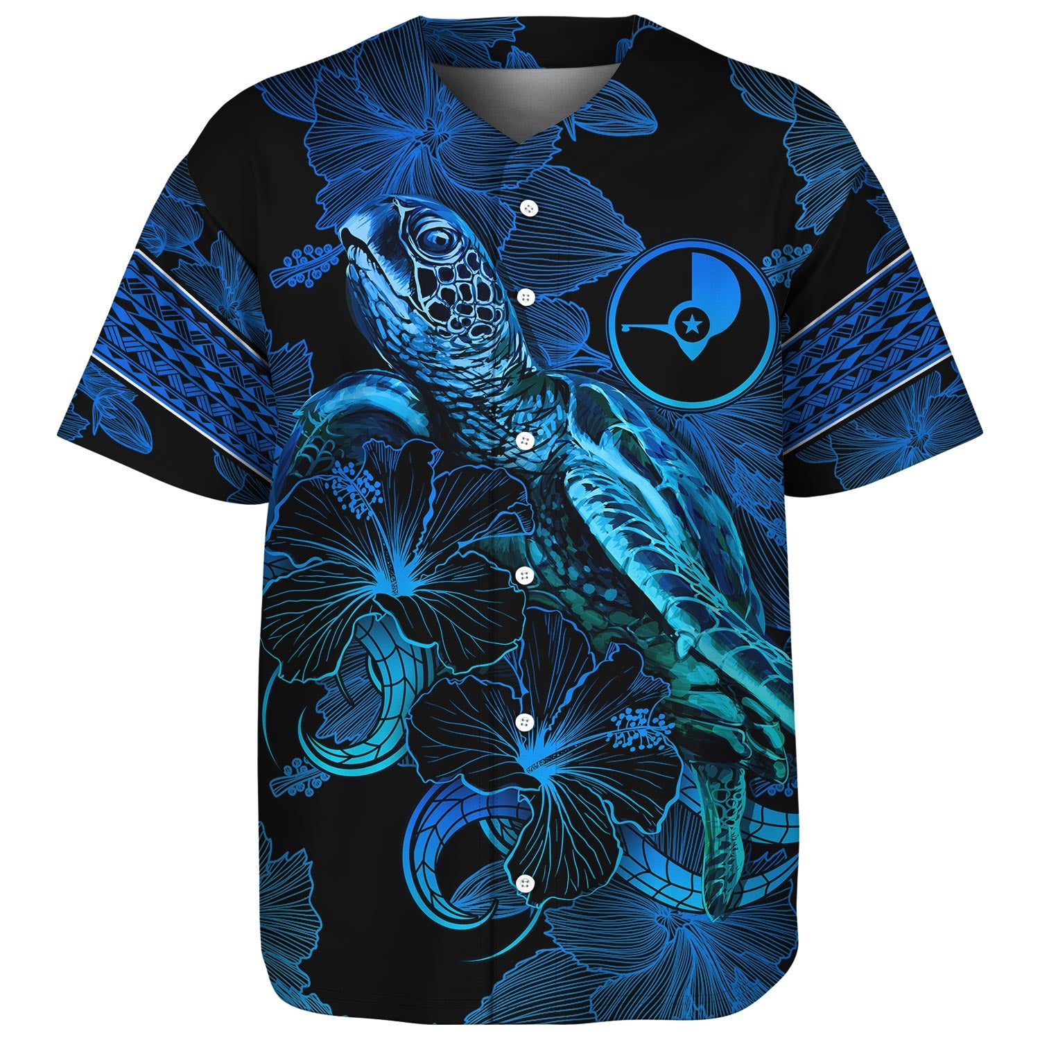 Yap State Baseball Shirt Sea Turtle With Blooming Hibiscus Flowers Tribal Blue