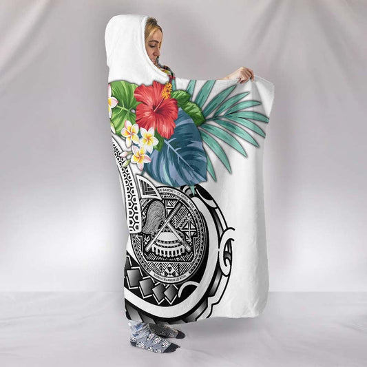 American Samoa Polynesian Hooded Blanket- Coat Of Arm With Hibiscus White