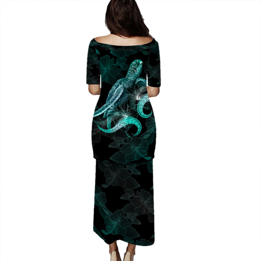 Austral Islands Puletasi - Sea Turtle With Blooming Hibiscus Flowers Turquoise