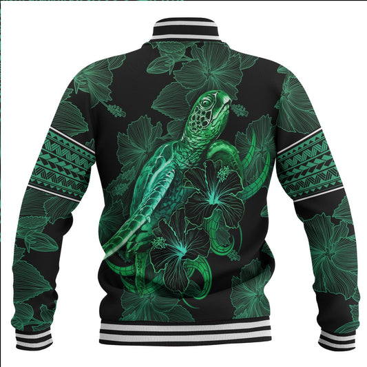 Tonga Baseball Jacket Sea Turtle With Blooming Hibiscus Flowers Tribal Green