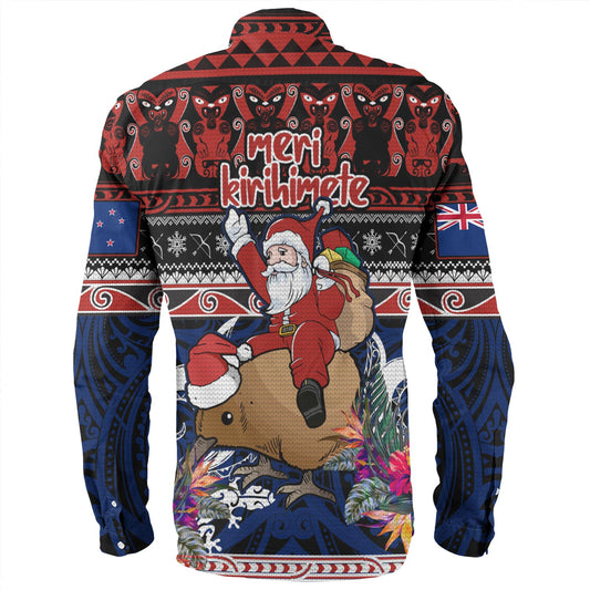 New Zealand Long Sleeve Shirt Santa Riding Kiwi Bird Meri Kirihimete Ugly Christmas Maori Patterns