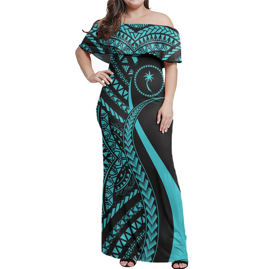 Chuuk State Combo Off Shoulder Long Dress And Shirt Polynesian Patterns Plumeria Flowers Special Style