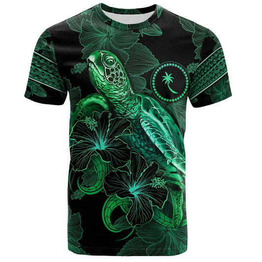 Chuuk State T-Shirt Sea Turtle With Blooming Hibiscus Flowers Tribal Green