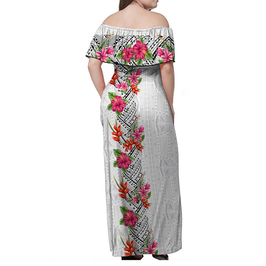Fiji Woman Off Shoulder Long Dress Fijian Masi Tapa Tropical Bouquet Design