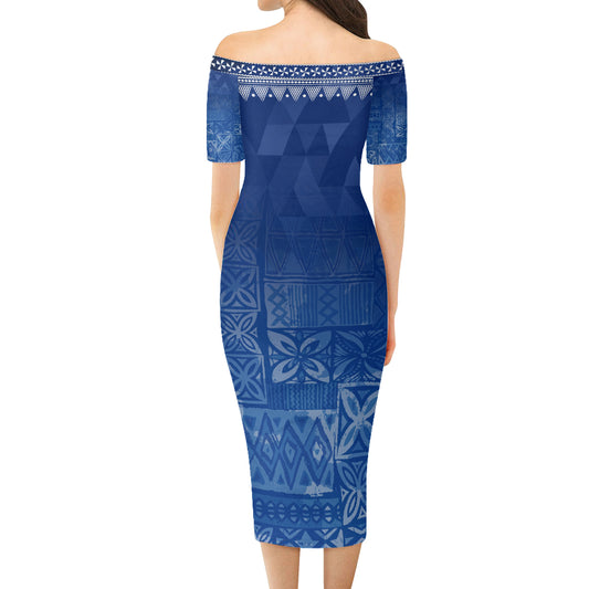 Fiji Short Sleeve Off The Shoulder Lady Dress Kakau Style Gradient Blue