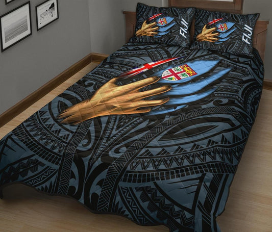 Fiji Personalised Quilt Bed Set - Fiji Seal With Polynesian Tattoo Style ( Blue)