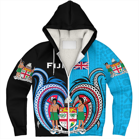 Fiji Sherpa Hoodie Fiji Map With Coat Of Arms Polynesian Tatau Half Black