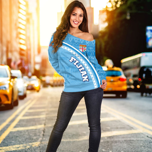 Fiji Off Shoulder Sweatshirt Flying Fijians Rugby Tribal Pattern With Shield 2023