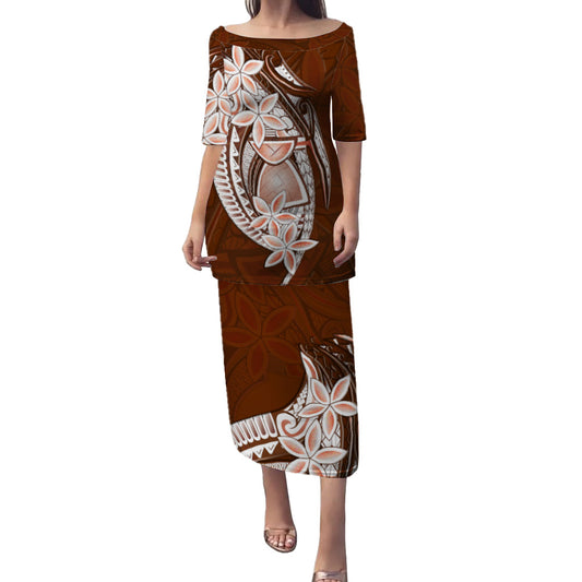 Guam Combo Puletasi And Shirt Latte Stone Plumeria Flowers