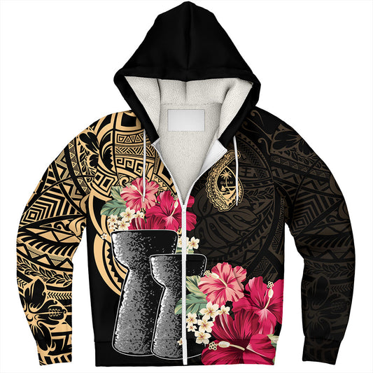 Guam Sherpa Hoodie Black Latte Stone With Hibiscus Flower Tribal