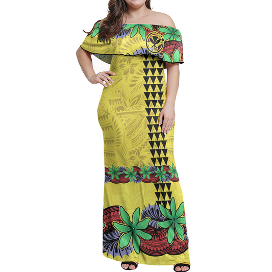Hawaii Off Shoulder Long Dress Kanaka Maoli Map Seal Tropical Flowers Yellow Color