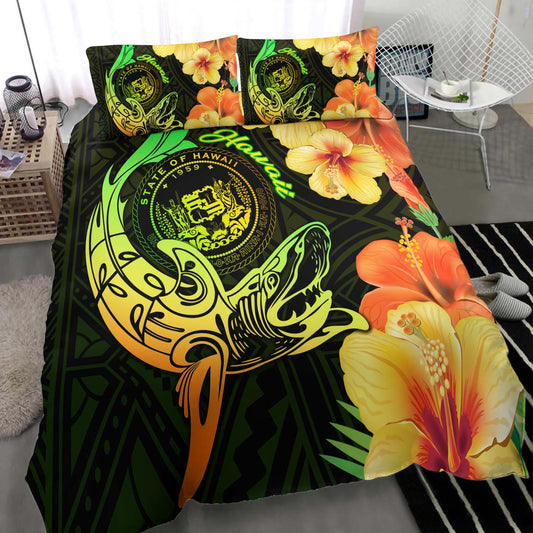 Hawaii Bedding Set Custom Hibiscus Flower And Sea Turtle Polynesian