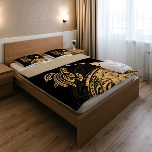 Hawaii Bedding Set Turtle Polynesian Map Plumeria Gold