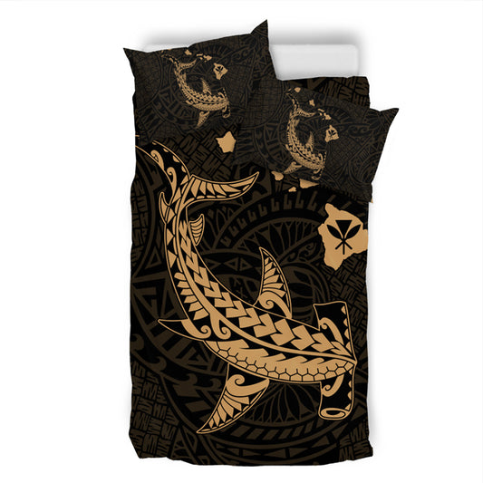 Hawaii Bedding Set Hawaiian Native Map Hammerhead Shark Gold