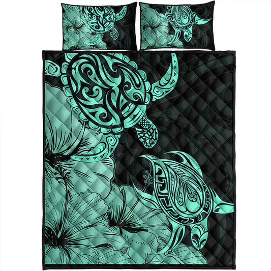 Hawaii Turtle Quilt Bed Set Polynesian Hibiscus Art Turquoise