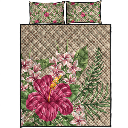 Hawaii Quilt Bed Set Hibiscus Plumeria Palm Leaves Lauhala Background Polynesian