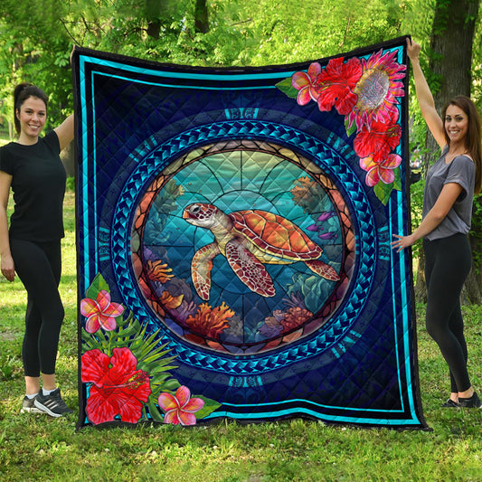 Hawaii Premium Quilt Sea Turtle With Plumeria Polynesian Patterns Retro Style