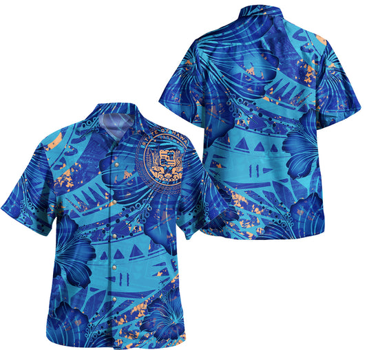 Hawaii Combo Puletasi And Shirt Hibiscus With Polynesian Pattern Blue Version