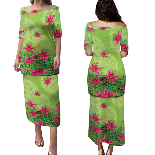 Hawaii Combo Puletasi And Shirt Lilies With Polynesian Pattern