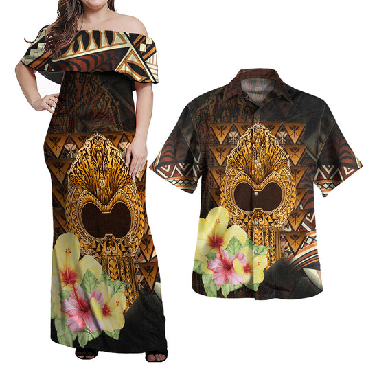 Hawaii Combo Off Shoulder Long Dress And Shirt Plumeria With Tribal Pattern