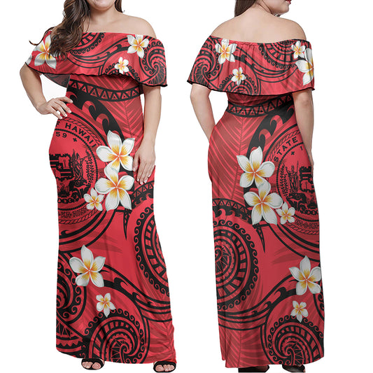 Hawaii Kanaka Maoli Combo Off Shoulder Long Dress And Shirt Polynesian Tropical Plumeria Tribal Red