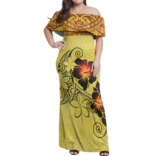 Hawaii Combo Off Shoulder Long Dress And Shirt Polynesian Tribal Patterns Hibiscus Flowers Yellow Color