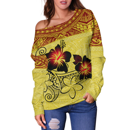 Hawaii Off Shoulder Sweatshirt Polynesian Tribal Patterns Hibiscus Flowers Yellow Color
