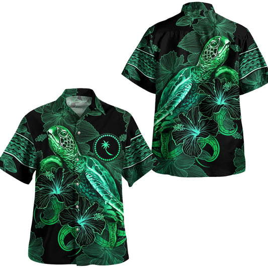 Northern Mariana Islands Hawaiian Shirt Sea Turtle With Blooming Hibiscus Flowers Tribal Green