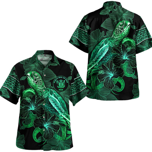 Niue Hawaiian Shirt Sea Turtle With Blooming Hibiscus Flowers Tribal Green