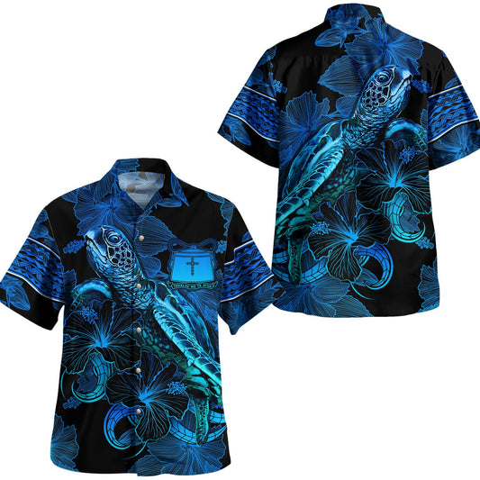 Niue Hawaiian Shirt Sea Turtle With Blooming Hibiscus Flowers Tribal Blue