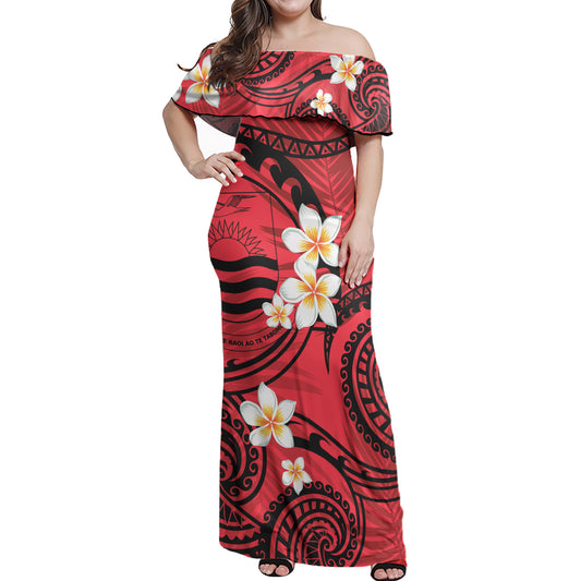 Kiribati Off Shoulder Long Dress Polynesian Tropical Plumeria Tribal Red