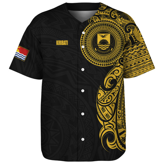 Kiribati Baseball Shirt Custom Polynesian Half Sleeve Gold Tattoo With Seal Black