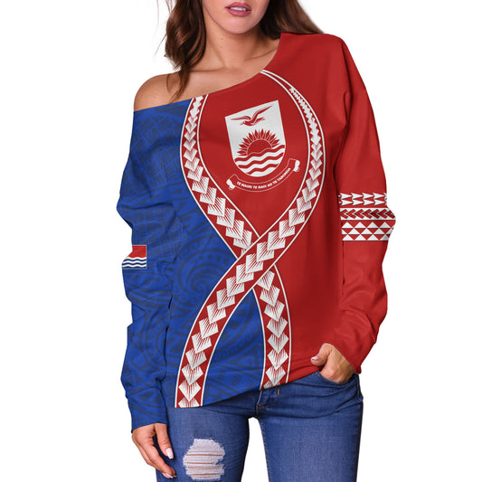 Kiribati Off Shoulder Sweatshirt Polynesian Tattoo Flag And Coat Of Arms