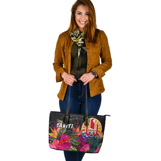 Tahiti Custom Personalised Leather Tote Polynesian Hibiscus Pattern