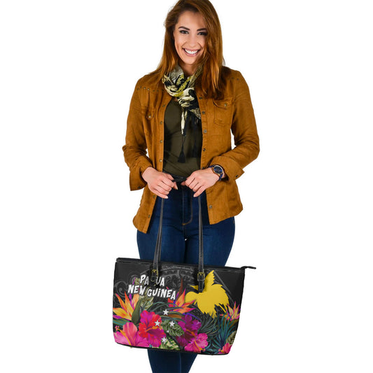 Papua New Guinea Custom Personalised Leather Tote Polynesian Hibiscus Pattern