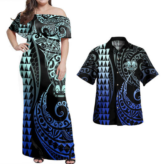 Marquesas Islands Combo Off Shoulder Long Dress And Shirt Sea Turtle With Blooming Hibiscus Flowers Tribal Blue