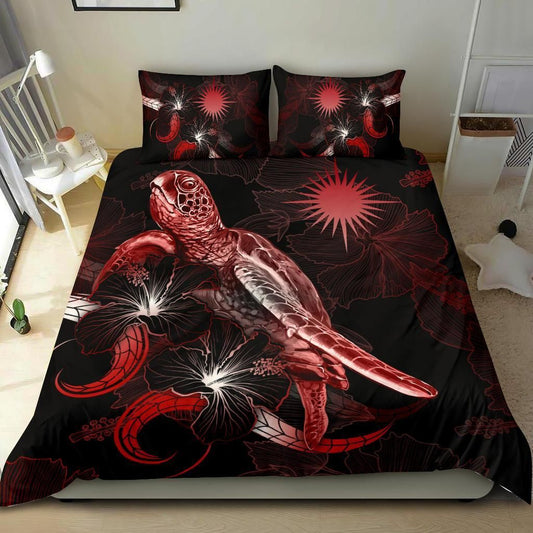 Marshall Islands Polynesian Bedding Set - Turtle With Blooming Hibiscus Red