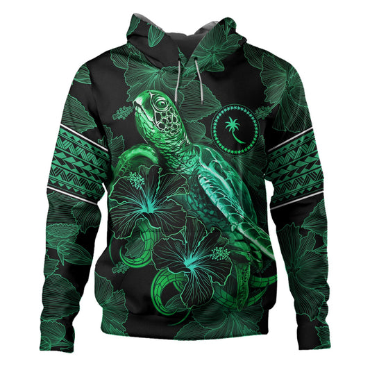 Chuuk State Hoodie Sea Turtle With Blooming Hibiscus Flowers Tribal Green
