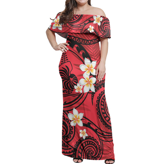New Caledonia Off Shoulder Long Dress Polynesian Tropical Plumeria Tribal Red
