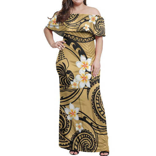 New Caledonia Off Shoulder Long Dress Plumeria Flowers Tribal Motif Yellow Version