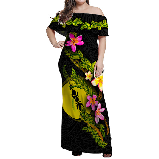 New Caledonia Woman Off Shoulder Long Dress Polynesian Gold Plumeria