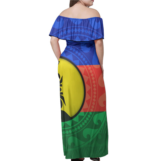 New Caledonia Flag Color With Traditional Patterns Women Off Shoulder Long Dress