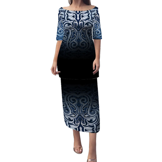 New Zealand Off Shoulder Long Dress Kakau Style Gradient Blue